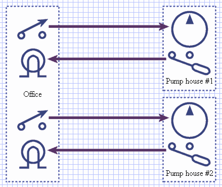 You have two pumps, #1 and #2, and an office on-site where the pumps can be controlled/monitored. Each pump will require one coil to control the pump motor, and each pump house has a high level indicator which will be attached to a discrete input. The office has two switches (one to control each pump) and two indicator lamps (one for each level indicator).