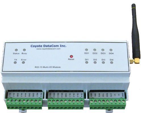 The RIO-15C is a low-cost, input-protected I/O module with four 12-bit analog to digital inputs, two 12-bit digital to analog outputs, four optically-isolated digital inputs, and four solid-state digital outputs. Each analog input channel is configured to measure 0 to 20mA (various forms of data scaling are included). The analog output channels can drive 4 to 20mA (different scales are included). The digital input channels can accumulate pulse counts for AMR applications.