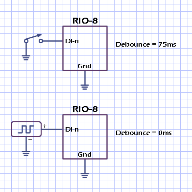 Use a Debounce value of 75 for mechanical inputs and a Debounce value of 0 for digital inputs.