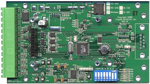 The RIO-9F products are configured, read, and controlled using Modbus RTU commands by wireless, RS-232 or RS-485 connection (see ordering information). The device's Modbus address can be set with a software configuration tool or with an on-board, 8-position, DIP switch.