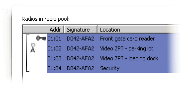 The pool panel gives you an easy mechanism to track all radios configured so far. The radios encountered to date are displayed in a list and organized by compatibility. A radio tower icon marks the currently connected radio in the list. Radios with encryption enabled will display with a key icon.