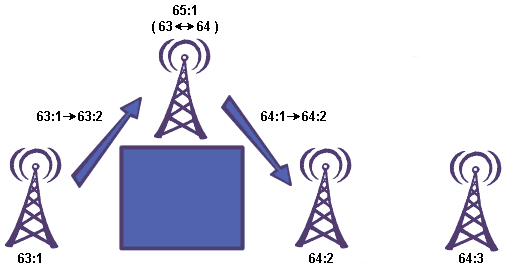 Suppose radio 63:1 needs to send a message to 64:2. Instead of designating 64:2 as the message target, the western radio would address the message to 63:2. The relay would receive this message and rewrite the source and destination to indicate that the message came from 64:1 and is intended for 64:2. The relay would then retransmit the message from high above both sets of radios, and eastern radio 64:2 could now receive its data.