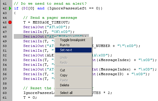 The "Set next" option on the Debug menu moves the execution pointer (the green triangle) to the selected line or object. This is a handy way to test another execution path.