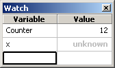 The watch panel allows you to inspect and modify the program's variables. Simply enter the variable's name in the first column and the variable's value will be displayed in the second. Recently modified values are highlighted in bold.